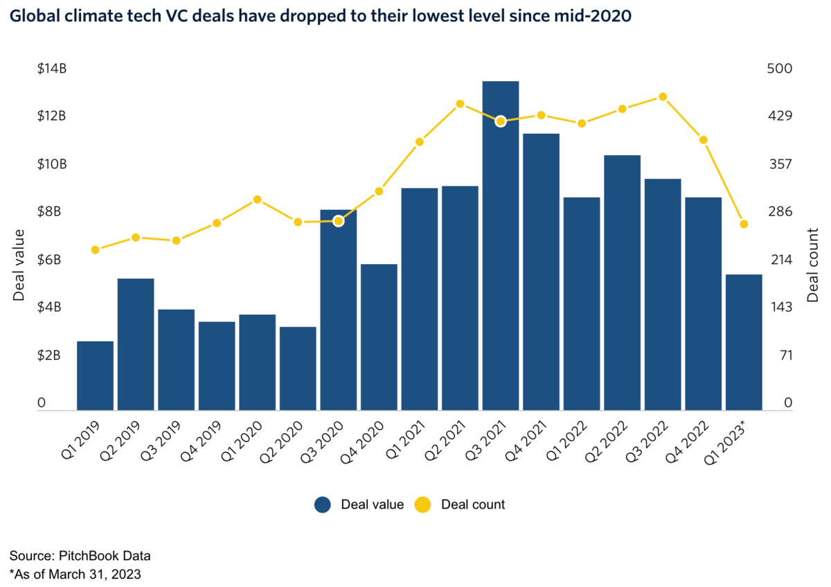 Just a year ago, roughly 25% of venture funding went into climate deals. Fast forward to today, and climate funding is now at a three-year low with no signs to reverse the trend.