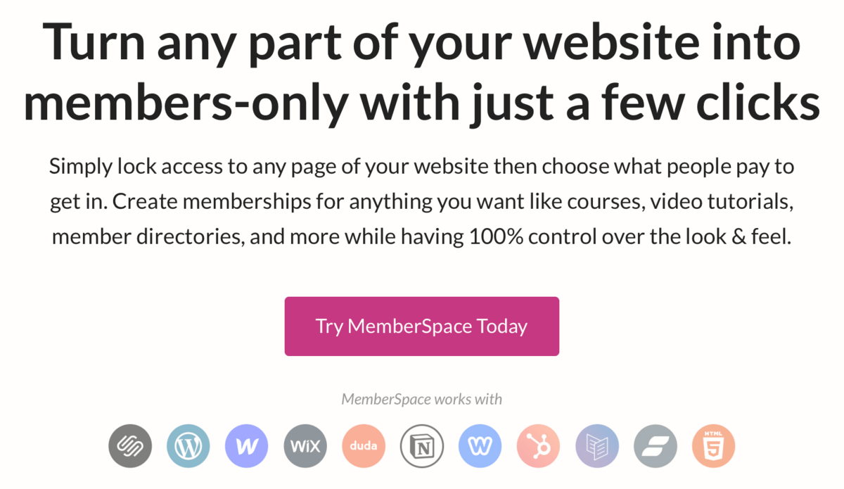 Sell memberships and digital products through Squarespace, WordPress, Wix, Notion.
